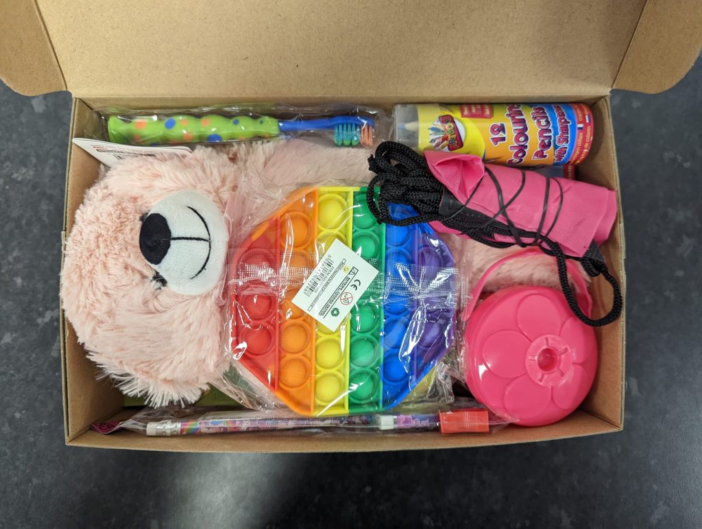 Shoeboxes are filled with goodies which would help bring a smile to a child’s face; fun gifts such as dolls, toys, footballs and puzzles, school supplies such as pens, pencils, notebooks, and day-to-day items that they might not have, such as toothbrushes, soap, hairbrushes, or socks.
